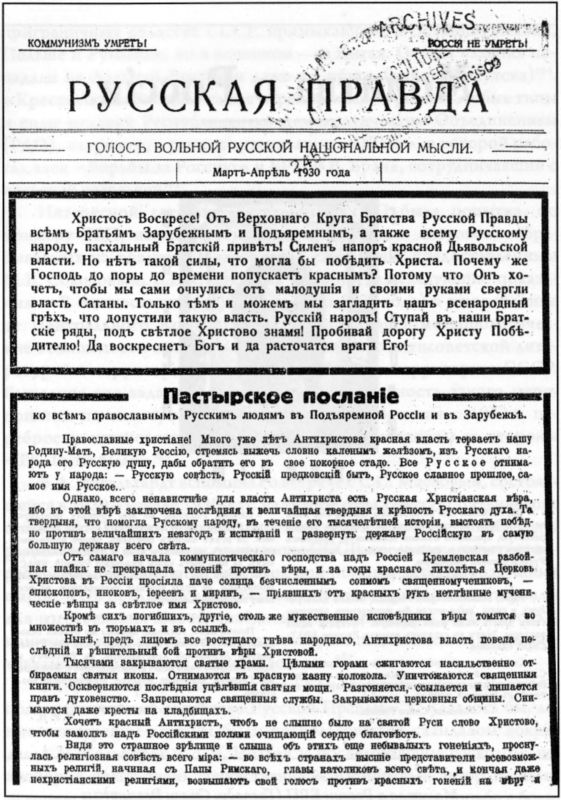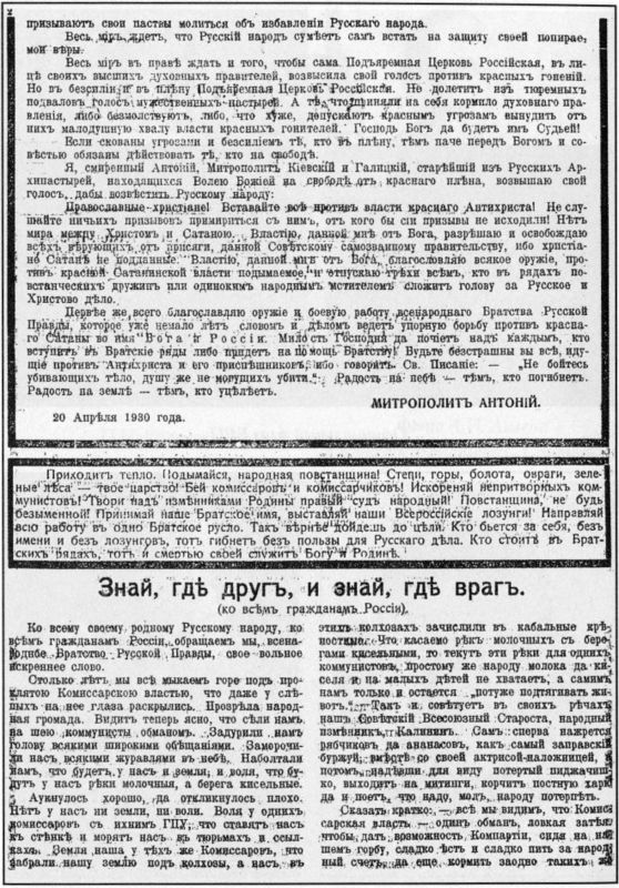Пастырское послание митрополита Антония Храповицкого (Русская правда, 1930, март-апр., с. 1–2)
