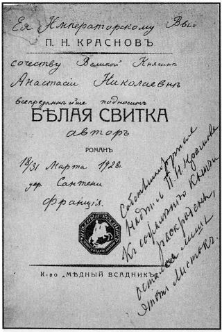 Титульный лист книги П.Н. Краснова «Белая Свитка» (изд-во «Медный всадник») о БРП, с дарственной надписью великой княгине Анастасии Николаевне