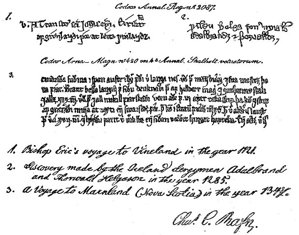 Древние исландские летописи сообщают, что в 1285 г. некие мореплаватели увидели будто бы на западе новую землю, но, видимо, на нее не высаживались. В позднейших дополнениях указывается, что это открытие сделали два брата священника Адальбранд и Торвальд Хельгесоны, позднее сообщившие о нем норвежскому королю Эйрику VI (1286—1319). Король так заинтересовался этим сообщением, что в 1289 г. повелел некоему Ланда-Рольфу более подробно исследовать обнаруженную новую землю. Для этого Рольф в 1290 г. прибыл в Исландию, однако о разведывательном плавании на запад, которое он должен был совершить, ничего не сообщается; отказались ли от такого плавания по неизвестным нам причинам или оно все же состоялось, но осталось безрезультатным, — мы не знаем, так что рассуждать об этом не стоит. Хроника больше ни слова не сообщает об этом событии, кроме краткого известия, что уполномоченный королем на это плавание Рольф умер в 1295 г.