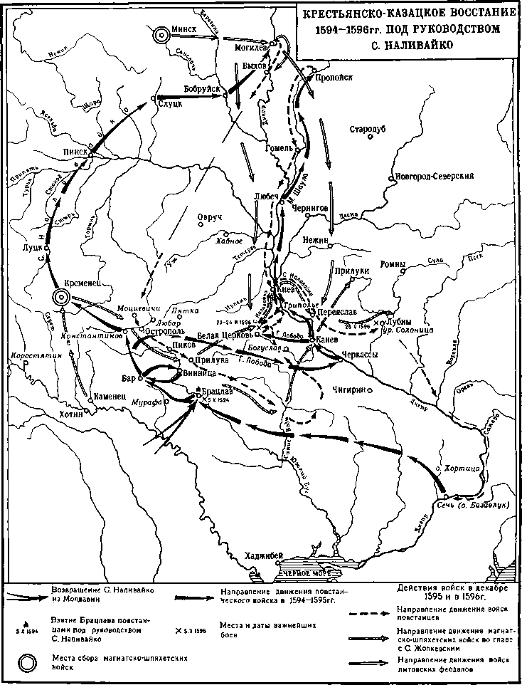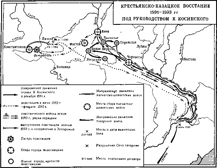 Крестьянско-казацкие восстания конца XVI в. были ответом народных масс на усиление эксплуатация и закрепощение крестьян, на экспансию польских феодалов и католической церкви. Если восстание 1591–1593 гг. под руководством К. Косинского ограничивалось территорией Киевщины, Запорожья, частью Брацлавщины и Волыни, то восстание 1594–1596 гг. под предводительством С. Наливайко охватило также Подолию, Волынь, значительную часть Белоруссии и нашло отклик в Польше. Оба восстания потерпели поражение, но они нанесли чувствительные удары польским, литовским, украинским и белорусским феодалам. В этих массовых народных выступлениях проявились как слабые стороны, свойственные всем крестьянским восстаниям эпохи феодализма (стихийность, неорганизованность, локальность), так и особенности, характерные для крестьянско-казацких восстаний на Украине. Эти особенности заключались в противодействии части реестровой старшины, присоединявшейся к восстанию, расширению антифеодального движения и постоянной склонности ее идти на компромисс с панами.