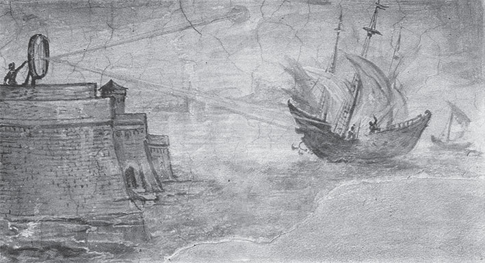 Причем ныне мало уж кто верит, что римский корабль можно было поджечь, фокусируя на его парусе солнечные «зайчики» от множества зеркал. Более правдоподобной кажется другая гипотеза. Зеркальный «зайчик» служил просто своеобразным целеуказателем, вроде лазерного прицела на современных снайперских винтовках. Поджигали же корабли меткой бомбардировкой – катапульты швыряли горшки все с тем же «греческим огнем».