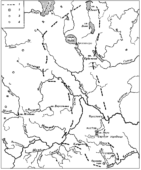 Ростовская земля в конце XI в.: 1 – граница, 2 – столица земли, 3 – города – административные центры, 4 – прочие города
