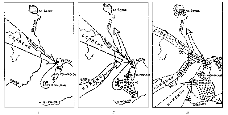 Славянское заселение Волго-Клязьминского междуречья. I – IX в., II – X в., III – XI–XII вв.