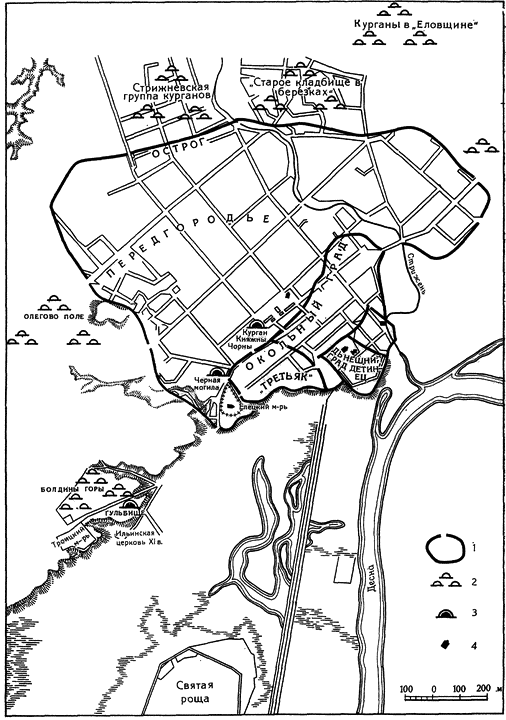 1 — древние укрепления XVIII в.; 2 — курганные группы — Х — ХII вв.; 3 — большие курганы X в.; 4 — церкви XI–XII вв.