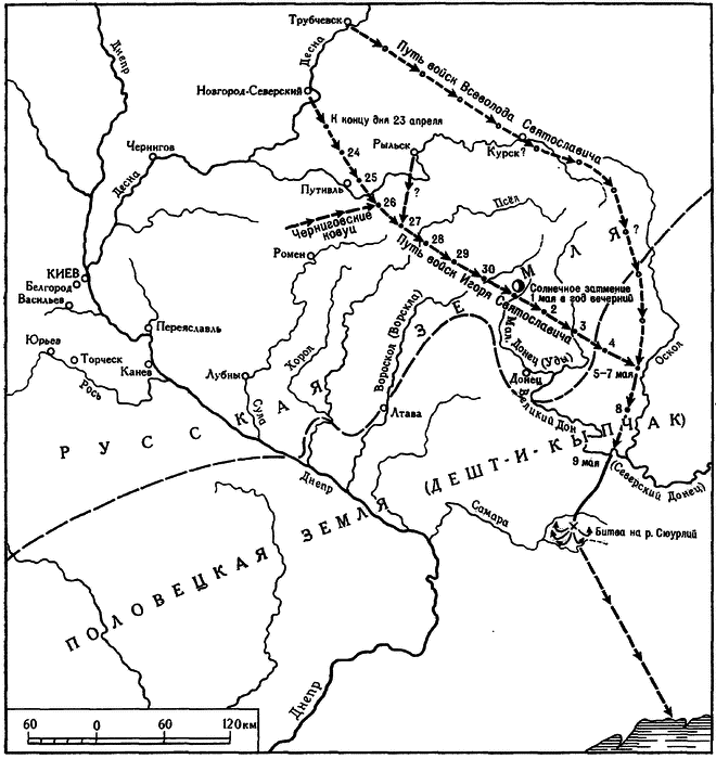 Игорь, узнав об этом, будто бы сказал своим вассалам: «А мы что же, не князья, что ли? Пойдем в поход и себе тоже славы добудем!» Поход начался 23 апреля. Когда войска подошли к русским рубежам, 1 мая 1185 г. было солнечное затмение, широко использованное в «Слове о полку Игореве» как поэтический образ: