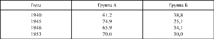 Удельный вес производства товаров группы А и группы Б в общем объеме промышленности, %