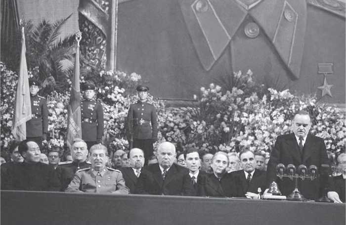 Председатель ЦК КПК Мао Цзэдун, член Политбюро Н.А. Булганин, И.В. Сталин, зам. председателя СЕПГ В. Ульбрихт, первый секретарь Московского обкома ВКП(б) Н.С. Хрущев, генеральный секретарь Коммунистической партии Испании Д. Ибаррури, генеральный секретарь Румынской рабочей партии Г. Георгиу-Деж в президиуме торжественного заседания в Большом театре СССР, посвященном 70-летию И.В. Сталина. Н.М. Шверник открывает заседание. Москва, 21.12. 1949 г. РГАКФД