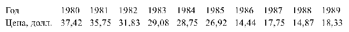 Экономический кризис и дефолт 1998 года. Поддержание стабильности рубля было важнейшим, знаковым признаком финансовой политики правительства. Выборы президента в 1996 г., огромные выплаты из государственного бюджета стали фактором, ослабившим государственную казну. Кроме этого, с 1995 г. наметилась долговременная перспектива снижения мировых цен на нефть — один из важнейших российских экспортных товаров. Цены на нефть стали снижаться уже в 1997 г. Баррель сырой нефти марки брент-смесь (ARA) стоил в январе 1997 г. 23,93, в феврале — 20,00, в марте — 18,52 долл. В январе 1998 г. цена сырой нефти в Нью-Йорке опустилась ниже 17 долл. за баррель, а к 9 января котировки февральских контрактов на сырую нефть на NYMEX достигли значения 6,63 долл. за баррель. Одновременно с этим упали цены и на газ — другую важную статью российского экспорта.