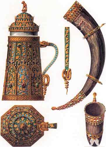 Ф. Солнцев Серебряная кружка, украшенная финифтью и каменьями, и турий рог, правленный золотом с каменьями