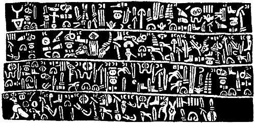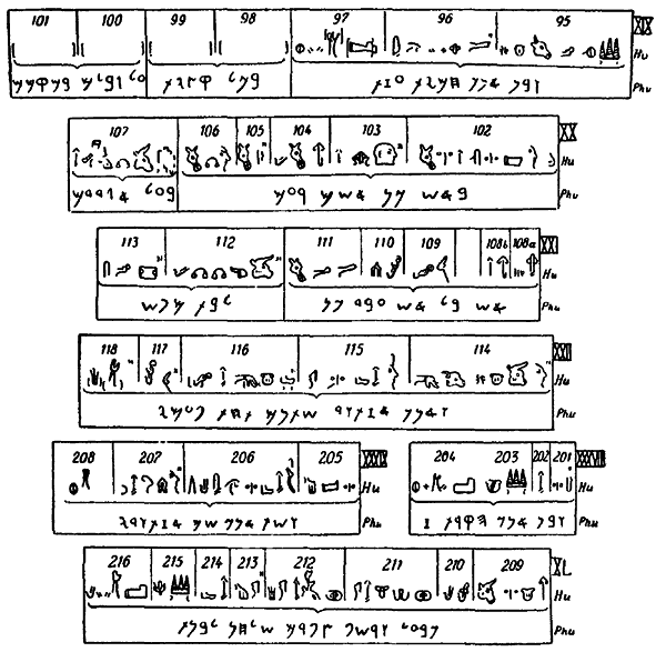 [По сравнению с изящными и элегантными формами египетских рисуночных знаков хеттские знаки имеют подчас грубый и неуклюжий вид, но зато они сохраняют сходство с предметами, которые изображают. Однако как раз у наиболее часто употребляющихся знаков их рисуночный характер вследствие стилизации сплошь и рядом оказывается неясным. Кто бы, например, предположил, что знаки, изображенные на рис. 114, представляют собой рисунки дома (план дома, как в египетском), солнца (стилизованное изображение солнечного диска с лучами), города (стилизованное изображение городского холма), страны (двойной городской холм), бога (вероятно, священный символ) и царя (остроконечная царская шапка)? Как и в египетском письме, все головы повернуты к началу строки, в том же направлении шагают ноги. Это помогает установить, что направление письма меняется от строки к строке, т. е. идет то справа налево, то слева направо (бустрофедон). Считается, что число хеттских иероглифических знаков превышает 400, однако во многих случаях нельзя точно сказать, имеем ли мы дело с самостоятельным знаком или с вариантом другого знака.]