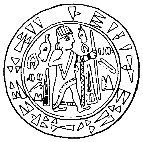Приводим важнейшие положения из статьи Мордтманна: Внешний круг содержит начертанную клинописью легенду; она состоит из девяти клинописных групп и начинается в том месте, на которое указывает пальцем фигура. Однако поскольку это печать, следует прежде всего сделать оттиск, после чего надпись будет представлять собой следующее: