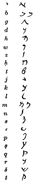 Рис. 106. Предложенное Гардинером сопоставление синайской письменности с египетскими иероглифами и семитским буквенным письмом.