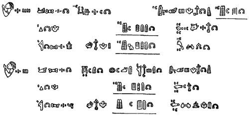 Чтение Мордтманном клинописного текста этой печати имело столь далеко идущие последствия, что мы считаем своим долгом привести его здесь. Оно содержит в зародыше два обстоятельства, повлиявшие в дальнейшем на всю историю дешифровки: это, во-первых, основа будущего важнейшего открытия Сейса и, во-вторых, роковое заблуждение, которое, будучи позднее подхвачено одним немецким ученым и защищаемое им с прямо-таки железным упрямством, в течение десятилетий сильнейшим образом сдерживало и тормозило дело дешифровки хеттских иероглифов.