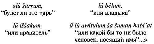 «Если же этот человек не будет чтить мои слова, написанные на моей стеле, пренебрежет моим проклятием, не побоится проклятия богов, отменит судебные решения, что я решал, исказит мои слова, изменит мои предначертания, выскоблит мое написанное имя и впишет свое или из страха перед этими проклятиями подучит другого, то…»