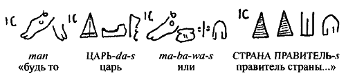 Правда, эта надпись оказалась более чем скудной для того, чтобы служить билингвой. Почти ничем не помогала она и в установлении звуковых значений — идеограммы, как известно, не дают никаких разъяснений по этому поводу.