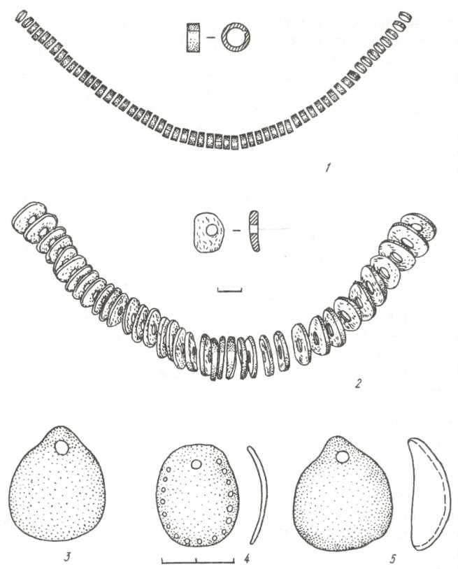 Рис. 102. Прикраси з міді та мушлі: намисто, оздоба поясу та одягу з поховань скелянської знаті: