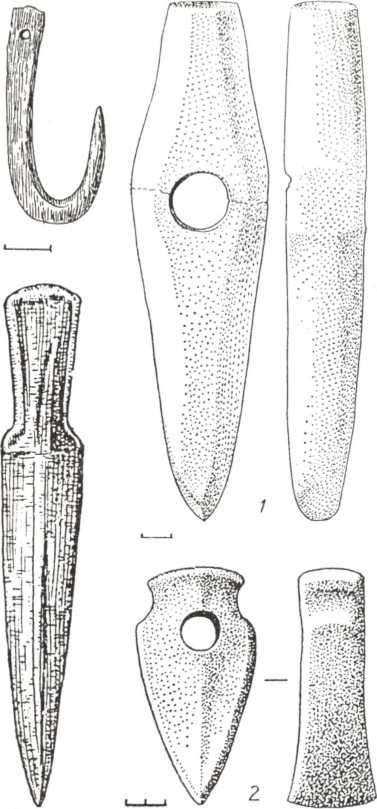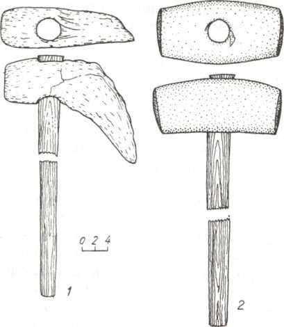 Рис. 107. Роговий клевець та кам’яний “молоток” як ознаки верхівки населення квітянської культури (Кам’янка-Дніпровська, курган 12, поховання 2; курган 14, поховання 2).