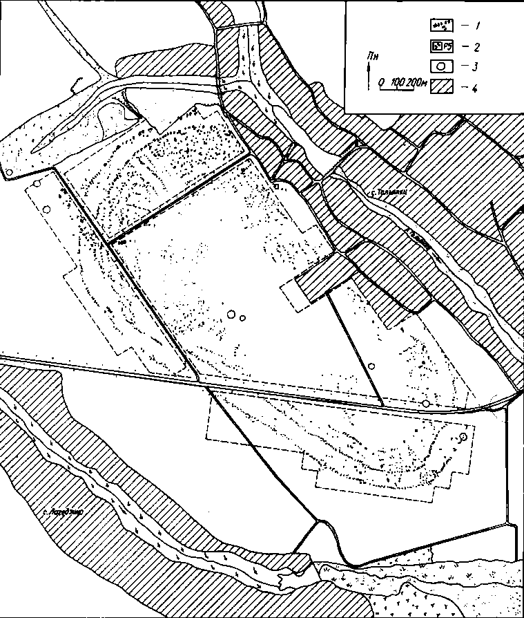 Рис. 63. План поселення-гіганта трипільської культури поблизу с. Тальянки на Черкащині ( 1 — житла, 2 — місця розкопів, 3 — кургани, 4 — забудова й городи села).