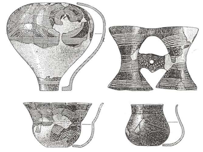 Рис. 73. Посуд середнього етапу із заглибленим орнаментом (Шкарівка).