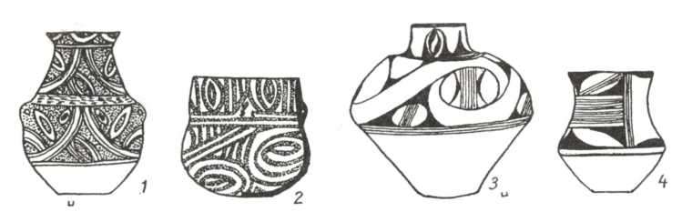 Рис. 74. Розписний посуд середнього етапу (1 — Кліщів, 2 — Голоскове, 3 — Бодаки, 4 — Казенна Громада).