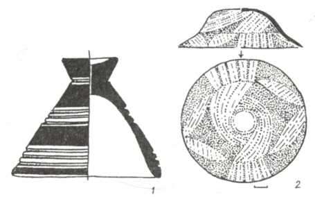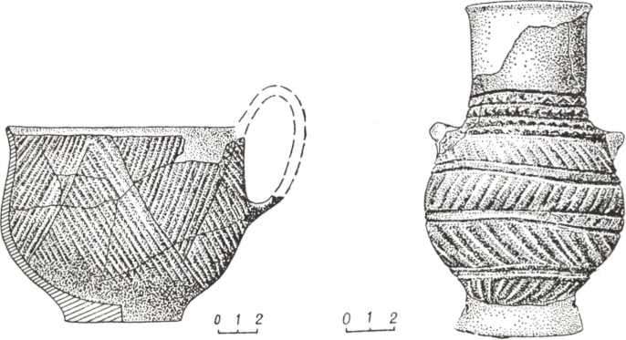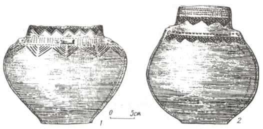 Рис. 98. Посуд культури кулястих амфор (1 — Довге, 2 — Увисла).