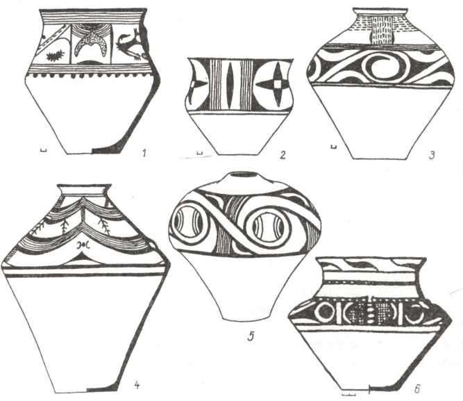 Рис. 78. Столовий посуд початку пізнього етапу трипільської культури (1 — Липчани, 2, 3 — Конівка, 4 — Стара Буда, 5 — Попудня, 6 — Тальянки).