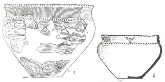 Рис. 80. Кухонний посуд початку пізнього етапу (1 — Чапаївка, 2 — Ялтушків).