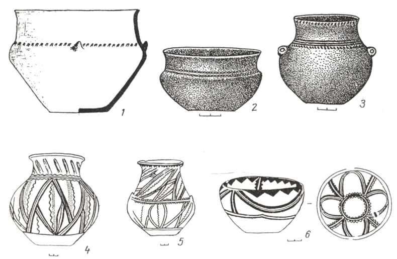 Рис. 81. Посуд із заглибленим (1—3) та розписним (4—б) орнаментом кінця пізнього етапу (1 — Махаринці, 2,3,5,6 — Усатове, 4 — Тудорове).