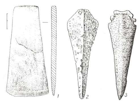 Рис. 86. Вістря до стріл та скребачка з Усатова.