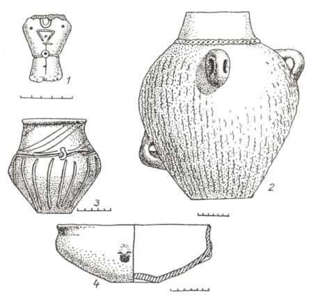 Рис. 99. Нижня частина жіночої фігурки та посуд культури Болград-Алдень ІІ (1, 2 — Нагорне ІІ, 3, 4 — Озерне).
