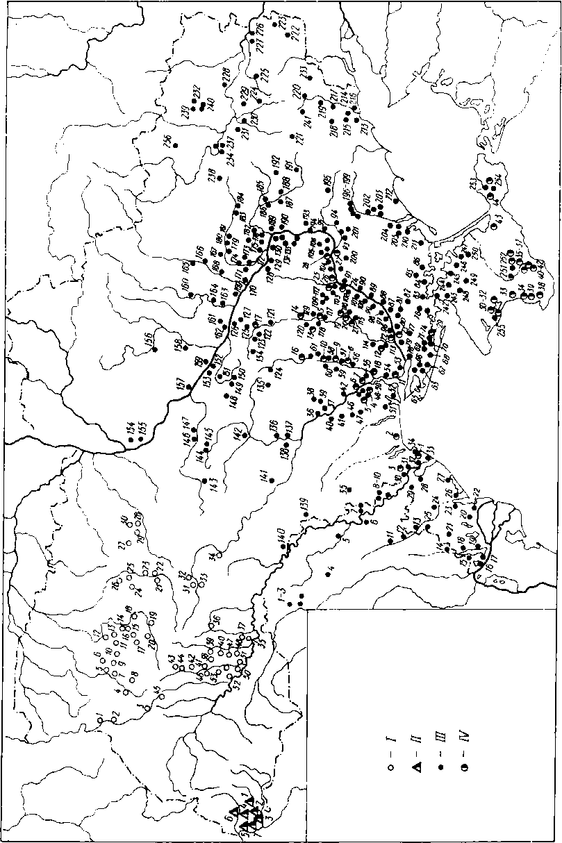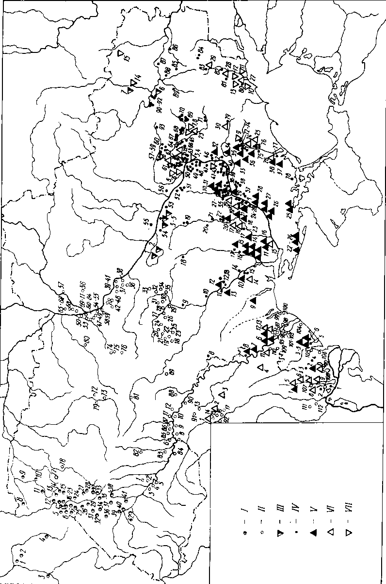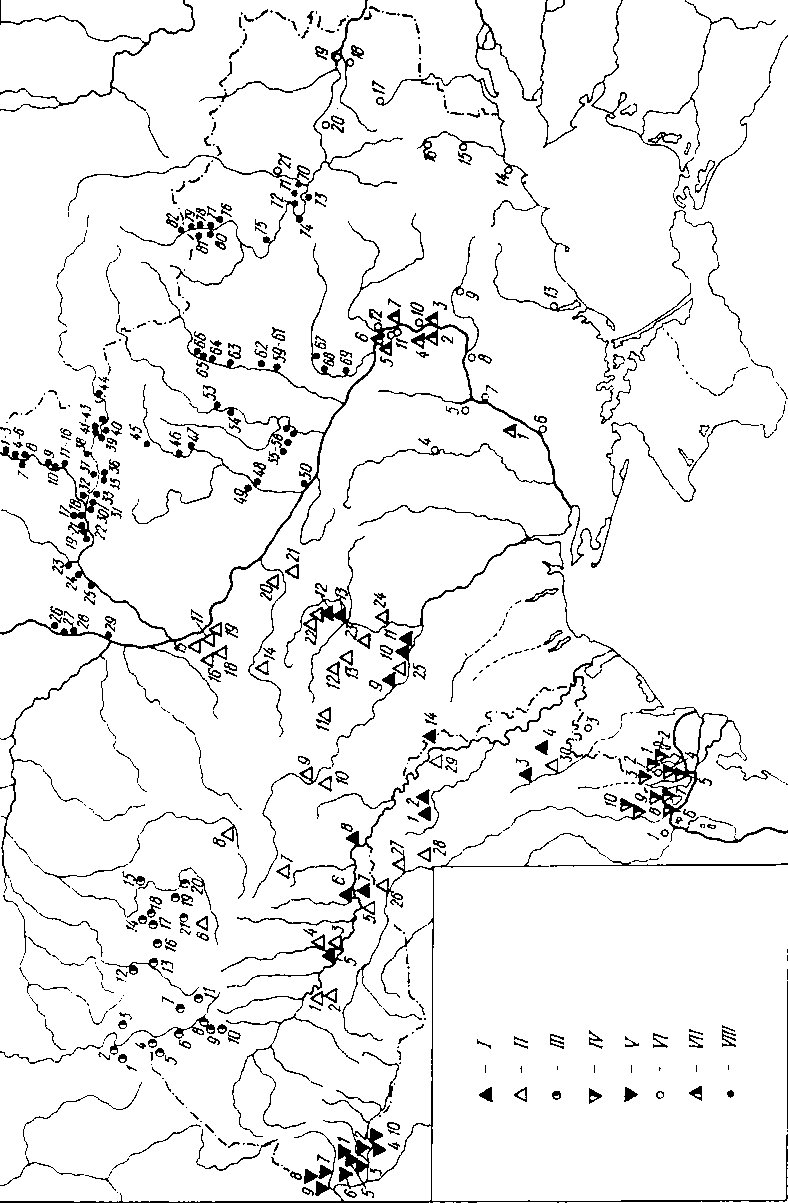 I — пам’ятки населення культури лійчастого посуду (нумерація за картою 7 “Археологии Украинской ССР”. Т. 1). II — пам’ятки населення пізнього етапу трипільської культури (нумерація за картою 7 “Археологии Украинской ССР”. Т. 1). ІІІ — пам’ятки населення дереївської культури: 1 — Тетянчино; 2 — Молохів Бугор; 3 — Кам'яні Потоки; 4 — Успенка; 5 — Дереївка; 6 — Минівський Яр; 7 — Олександрія. IV — пам’ятки населення квітянської культури: 1 — Новосільське; 2 — Етулія; 3 — Огородне; 4 — Холмське; 5 — Вишневе; 6 — Кочковате; 7 — Григоріопіль; 8 — Тимково; 9 — Єрмолаївка; 10 — Серезліївка; 11 — Виноградний Сад; 12 — Бузький II; 13 — Петропавлівка; 14 — Нова Одеса ІІІ; 15 — Ковалівна; 16 — Костянтинівка; 17 — Старогорожено; 18 — Кіровоград; 19 — Чечеліївка; 20 — Валове; 21 — Кривий Ріг; 22 — Широке; 23 — Вісунськ; 24 — Михайлівна; 25 — Золота Балка; 26 — Нововоронцівка; 27 — 35 — Орджонікідзе; 36 — Нікополь; 37 — Первомаївка; 38 — Кам'янка-Дніпровська, 39 — Новокиївка; 40 — Верхня Тарасівна; 41 — Новий Світ; 42 — Садове; 43 — Виводове; 44 — Мар'ївка; 45 — Разумівка; 46 — Любимівка; 47 — Калинівка; 48 — Тракторне; 49 — Новоолександрівка; 50 — Дніпропетровськ; 51 — Іколівка; 52 — Пушкарівка; 53 — Млинок; 54 — Велика Андрусівка; 55 — Цегельня; 56 — Орлик; 57 — 59 — Бузовка, Котівка, Дичково; 60 — Терни; 61 — Верхня Маївка; 62 — Хащеве; 63 — Чаплі; 64 — Булахівка; 65 — Павлоград; 66 — Троїцьке; 67 — Вербки; 68 — Богданівна; 69 — Миколаївка; 70 — Петропавлівка; 71 — Орестопіль; 72 — Виноградне; 73 — Заможне; 74 — Жовтневе; 75 — Терпіння; 76 — Ново-Пилипівка; 77 — Юр'ївка; 78 — Василівка; 79 — Пологи; 80 — Куйбишеве; 81 — Новоандріївка; 82 — Василівка; 83 — Високе; 84 — Шахтарськ; 85 — Переїзна; 86 — Зимогір'я; 87 — Ступки; 88 — Родіонівка; 89 — Камишевака; 90 — 92 — Кам'янка, Ковалівна, Шпаківка; 93 — Князєво. V — пам’ятки населення нижньомихайлівської культури: 1 — Саратени; 2 — Холмське; 3 — Траповка; 4 — Жовтий Яр; 5 — Хаджидер; 6 — Новокотовськ, Никольське; 7 — Григоріопіль; 8 — Бутори; 9 — Кошари; 10 — Ковалівка; 11 — Лиманці; 12 — п. Бузький; 13 — Виноградний; 14 — Калинівка; 15 — Костянтинівка; 16 — Олександрівка; 17 — Баратівка; 18 — Велика Олександрівка; 19 — Старосілля; 20 — Широке; 21 — Михайлівна (нижній шар); 22 — Облої; 23 — Скадовськ; 24 — Озерне; 25 — Долинське; 26 — Софіївка; 27 — Любимівка; 28 — Васильївка; 29 — Балки; 30 — Нікополь; 31 — Орджонікідзе; 32 — Михайлівна; 33 — Василівка; 34 — Малокатеринівка; 35 — Заможне; 36 — Виноградне; 37 — Радіонівка; 38 — Вовчанськ. VI — пам’ятки населення животілівсько-вовчанської групи: 1 — Костешти; 2 — Нові Дуруітори; 3 — Бурсучени; 4 — Ришкани; 5 — Саратени; 6 — Казаклія; 7 — 8 — Тараклія; 9 — Болград; 10 — Суворово; 11 — Гура-Бикулуй; 12 — 13 — Тирасполь; 14 — Ковалівка; 15 — Баратівка; 16 — Велика Олександрівка; 17 — Старосілля; 18 — Нововоронцівка; 19 — Усть-Кам'янка; 20 — Животилівка; 21 — Соколово; 22 — Павлоград; 23 — Богу слав; 24 — Виноградне; 25 — Новопилипівка (Аккермень); 26 — Вовчанськ; 27 — Приморське; 28 — Василівка; 29 — Олександрівка; 30 — Пологи. VII — пам’ятки населення рєпінської культури: 1 — Михайлівна (середній шар); 2 — Дурна Скеля; 3 — Стрільча Скеля; 4 — Соколове; 5, 6 — Верхня Маївка; 7, 8 — Богуслав; 9 — Заможне; 10 — Огородне; 11 — Волонтьорівка; 12 — Заможне; 13 — Кременівка; 14 — Олександрія; 15 — Підгорівка.