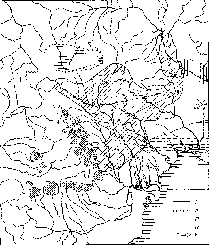І — трипільська культура: а — коломийщинська група, б — чапаївсько-лукашівська, в — томашівська, г — косенівська, д — середньобузька, е — верхньодністровська; II — лендельська культура; III — середньостогівська спільність (дереївська культура); IV — нижньомихайлівська культура; V — квітянська (постмаріупільська) культура.