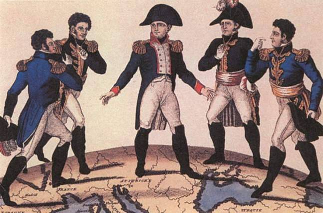 «Наполеон Бонапарт делит Европу между своими родственниками» (Английская гравюра) Тем временем правофланговая группировка русских войск под командованием генерала А. И. Горчакова попал а в крайне тяжелое положение: отделенные от основных частей, они оказались в тисках французов и вынуждены были штыками пробивать себе путь к реке. Одни из них погибли, а другие сдались французам. Почти вся русская артиллерия попала в руки Бонапарта. В 23 часа грохот орудий наконец умолк, и наступившая тишина возвестила об окончании сражения. Русская армия была разгромлена, а потери французов составили от 7 до 8 тыс. (по разным источникам) человек убитыми и ранеными. Наполеон пребывал в отличном настроении, гордый своей фридландской победой, одержанной в годовщину битвы при Маренго.