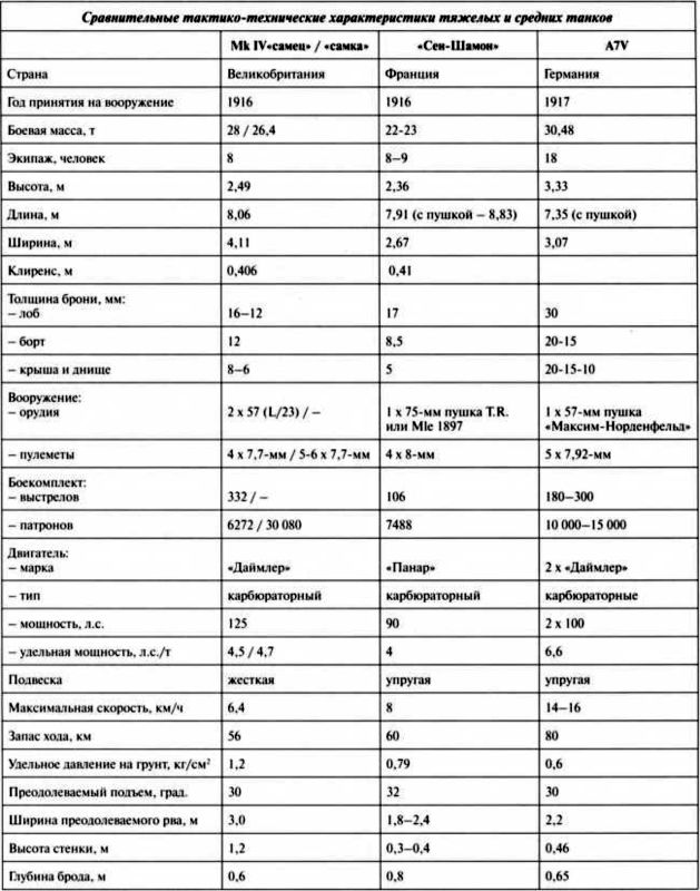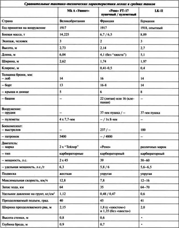 Интересно сравнить основные тактико-технические характеристики танков, построенных в Германии в последние два года войны, с характеристиками британских и французских танков. При этом, разумеется, нужно помнить о разнице требований, предъявлявшихся к танкам при разработке. Скажем, британский Мк А «Уиппет» создавался как маневренный «кавалерийский» танк, а французский «Рено» FT — как танк сопровождения пехоты. Германский LK-II по своим ходовым качествам ближе к «Уиппет».