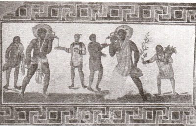 Два раба тащат на плечах большие кувшины с вином. На них — типичное одеяние рабов, на шее — длинное ожерелье с амулетом против сглаза. На одном кувшине написано ??? (т. е. ???), «пей», на другом — ZHCHC (?????), «должен жить», — слова, которые обычно встречаются на кубках и кувшинах с вином. Один из кувшинов украшен магическими фигурами против сглаза, какие часто встречаются на постройках и предметах бытового обихода как римской, так и современной Африки, и надо отметить, что их никогда не собирали и не исследовали. Раб, находящийся слева, держит в правой руке зеленую ветвь; раб, стоящий справа, держит в левой руке бутыль с водой. Позади первого стоит юноша-раб, подносящий воду и полотенца, позади второго — другой юноша с зеленой ветвью в правой руке, а в левой он держит корзину с цветами. Рабы наливают из своих кувшинов вино двум мужчинам; один из них одет как цирковой возница. Фреска изображает подготовку к какой-то пирушке в частном доме или торговлю вином. Подобные сцены часто изображались в столовых богатых дворцов, а в скромных винных лавках часто висели их копии.