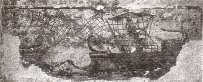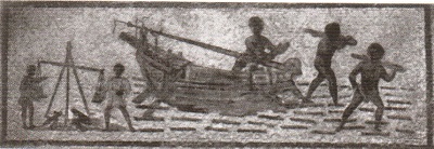 Торговое судно, стоящее на разгрузке, видимо, слитков металла в мелководной гавани. Два работника идут вброд по мелководью, каждый со слитком на плече. На берегу еще двое мужчин, они взвешивают слитки на больших весах. Мозаика хорошо иллюстрирует те особые условия, которыми отличалось судоходство в мелководных заливах.