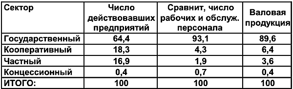 Для промышленности периода нэпа было характерно наличие различных общественно-экономических секторов: национализированной государственной промышленности, кооперативного, частнохозяйственного капитализма, мелкого кустарного и ремесленного производства. Эти уклады занимали различное место в экономической структуре (%):