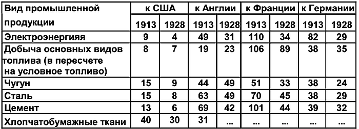 Причем в таблице приводятся официальные, как мы убедились, значительно завышенные, данные о состоянии советской промышленности. И даже судя по ним, в 20-е годы бурными темпами шло отставание СССР от США, Франции, более медленными — от Германии и лишь по отношению к Англии складывалась более благоприятная картина.