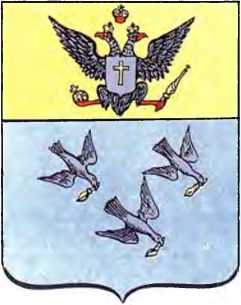 Старинный герб Радомышля. Город расположен недалеко от Коростеня, сожженного княгиней Ольгой. Птицы с «пламенниками» напоминают о мести Ольги древлянам.