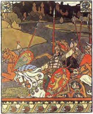 Былинный богатырь Вольга с дружиною. Рисунок И. Билибина, 1902 г.