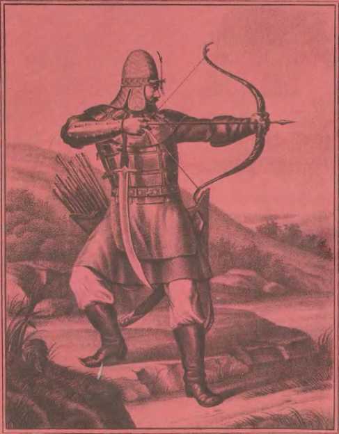 Русский ратник в калантыре (доспехе из крупных металлических пластин) с бармицей, XII — ХIII вв. Старинная литография.