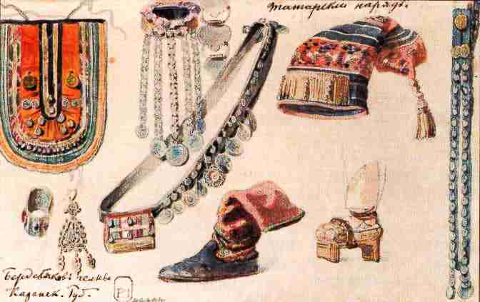 Одежда татар состоит из короткой бумажной рубахи и шаровар, иногда суконных и пестрых бумажных. Важнейшие из татар носят пестрый бумажный кафтан и сверх него надевают кафтан суконный, подбитый лисьим или собольим мехом; голову покрывают меховой шапкою; сапоги носят красные сафьянные, но без шпор. Простые татары накидывают на плечи овчинный тулуп, который зимой носят шерстью вниз, а летом и во время дождя — шерстью наружу. Встретив их в таком одеянии нечаянно в поле, испугаешься: подумаешь, что это белые медведи, вцепившиеся в лошадей. То же самое делают они и с овчинными шапками.
