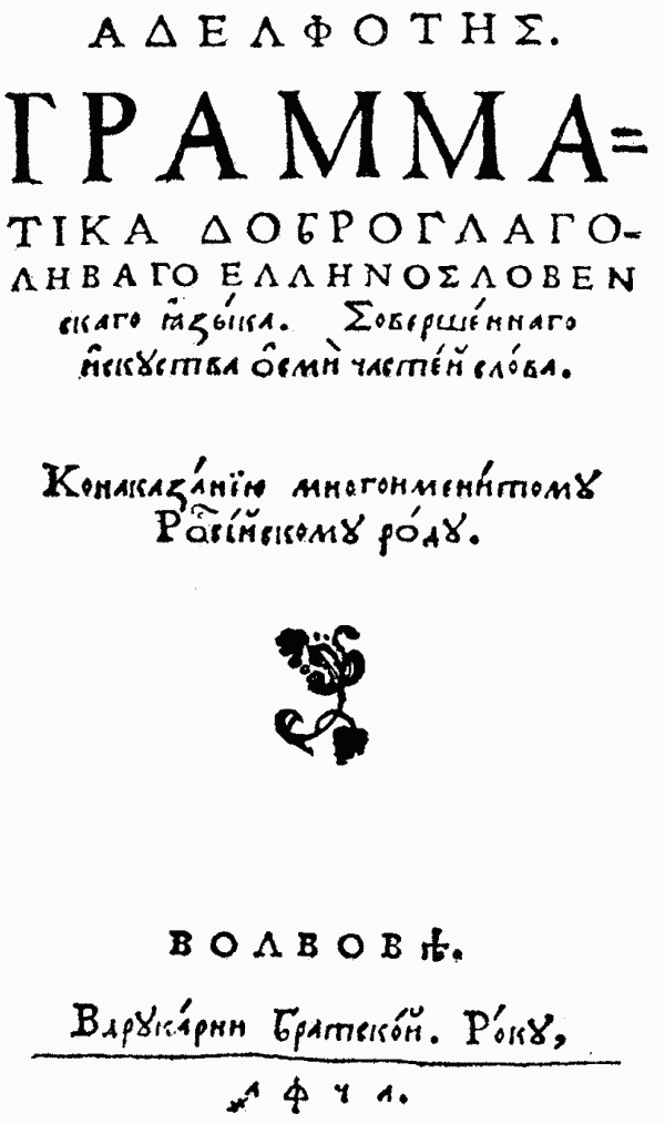 Очередная фальсификация М. С. Грушевского «Из иллюстрированной истории Украины». Подпись под рисунком: «Греческо-украинская грамматика 1591 года, составленная в львовской братской школе», не соответствует рисунку. На самом деле это русская грамматика, по которой учились в Малой и в Великой России