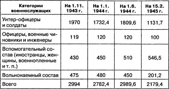 На 4 августа того же года общая численность военнослужащих немецких вооруженных сил составляла 7331 тыс. человек, которые распределялись следующим образом: