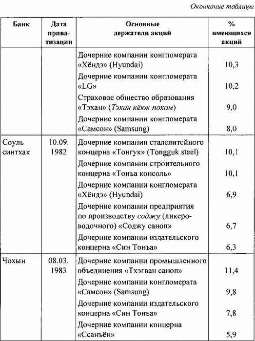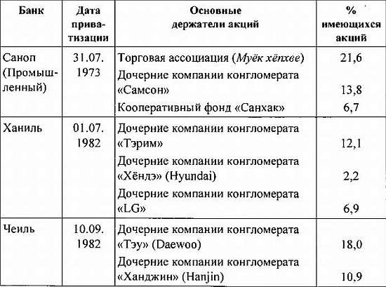 В декабре 1980 г. правительство обнародовало «План либерализации управления коммерческими банками», что было одной из мер по возвращению банков под управление частных акционеров. Оно затем продало 50 % своих акций в старейших банках «Ханиль», «Чеиль», «Синтхак» и «Чохын». Стремясь предотвратить переход банков в руки монополистов, оно также ограничило количество акций в руках одного держателя восемью процентами. Однако чэболь обошли эти ограничения, использовав для покупки акций свои дочерние компании и, в результате, сосредоточив в своих руках от 20 до 27 % акций этих банков (см. Таблицу 18).
