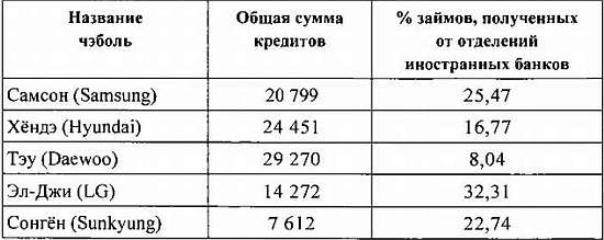 С 1980-х годов в результате открытия финансового рынка усилилась зависимость южнокорейской экономики от международного разделения труда, и одновременно укрепилось господство чэболь на внутреннем финансовом рынке. Они практически полностью контролировали вторичный финансовый рынок: компании по выдаче краткосрочных ссуд, смешанные финансовые и инвестиционные компании, которые начали возникать в стране с 1970-х годов[58], и приобрели существенный контроль над частично приватизированными коммерческими банками.
