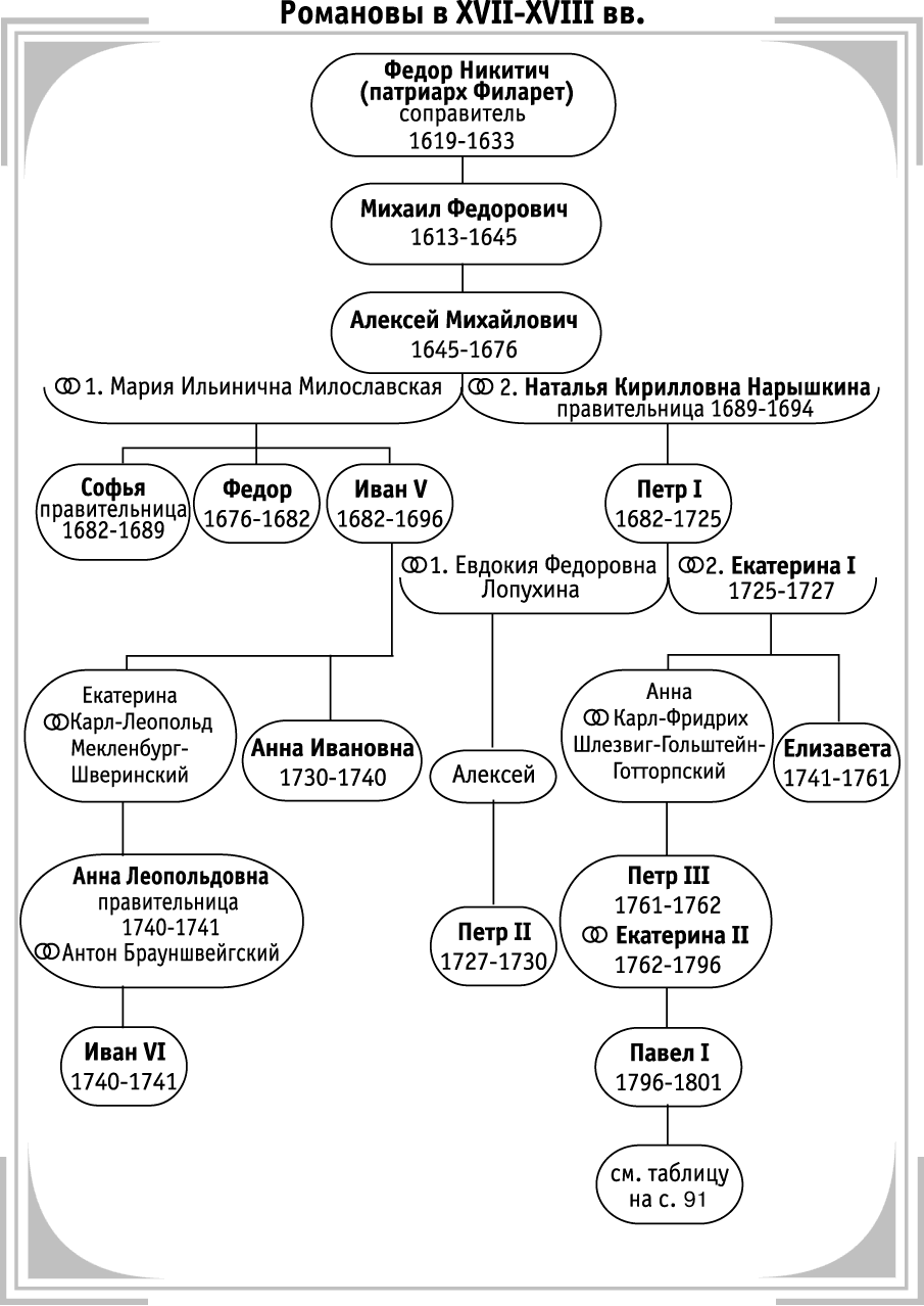 В таблице приведены только те представители Романовых, которые занимали престол, а также родоначальники отдельных ветвей династии. После царствовавших особ указаны годы их правления. Знак означает брачный союз.