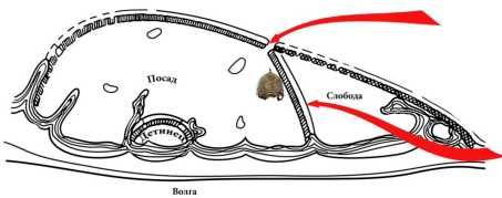 В подтверждение этой догадки приводились данные археологических разведывательных работ, в ходе которых был произведен обмер Городецких валов и рвов. Было установлено, что на отрезке вала (отгораживающего слободу от посада), с внутренней стороны которого и был обнаружен шлем, на протяжении 540 м вал и ров имеют меньшие размеры, чем на других участках. Остроконечная форма вершины вала в этом месте и отсутствие на ней широкой площадки для городни позволяют утверждать, что в качестве крепостной стены здесь использовался обычный частокол; тем более что его обуглившиеся остатки были найдены при обследовании 1955 г. у выхода вала к Волге[125]. Скорее всего, на данном участке отсутствовали и башни, либо они имели малые размеры, так как линия вала на их предполагаемых местах прерывается незначительно. Соседние же участки вала резко отличаются и размерами и устройством, где стены и башни были очень мощными. Строительство более мощных стен, чем первоначальные, отмечено в русских летописях под 1391 г.[126] Таким образом, использование противником для штурма стыкового участка с более мощными укреплениями и участка частокольной стены позволяет говорить об осаде 1408 г., и, надо полагать, в этом случае предание указывает место прорыва достаточно точно. Именно здесь легче всего было штурмовать укрепления. Проездная башня, на месте расширенного в середине XX в. въезда в город со стороны Нижней Слободы и деревни Обросихи, где теперь пролегает асфальтированная дорога на ул. Маслова, видимо, также была небольшого размера. Предположительно именно через нее нападавшие прорвались на территорию посада (рис. 52). О направлении удара противника свидетельствуют и народные предания. Согласно легенде, немногочисленные защитники города приняли смертный бой возле современной деревни Черепово; от найденных здесь человеческих черепов деревня и получила свое название[127]. Однако народные предания не очень надежный носитель исторической памяти, да и археологических изысканий в окрестностях деревни Черепово не проводилось. К тому же если после нашествия Едигея городецкая округа была опустошена и начала заселяться и осваиваться лишь полтора века спустя, то кто же мог быть носителем памяти о трагичных событиях? Поэтому остается только гадать, откуда происходят найденные костные останки — из массового захоронения или же с территории какого-то могильника. Проникнуть в слободу враги могли тем путем, о котором говорит легенда, — по оврагу, поднимающемуся от кромки волжского берега вдоль горы Шихан. Именно с этой горой народное сказание связывает размещение ставки вражеского предводителя[128]. Однако представляется, что этот рассказ не более чем поздняя выдумка, так как шихан — это широко распространенное в топонимике тюркское слово, указывающее на микрорельеф местности и буквально означающее «бугор, холм». Такие Шихан-горы имеются в окрестностях Пензы, Самары, в Стерлитамакском районе Республики Башкирия. Все их трудно связать с именем одного и того же мифического Шихана или хана Ши. Теоретически, конечно, можно было бы предположить, что ставка какого-то вражеского военачальника, а возможно, и самого эмира Едигея действительно могла находиться на Шихане, но крайне затруднительно было руководить штурмом с этого места, так как обзор города в значительной мере закрыв