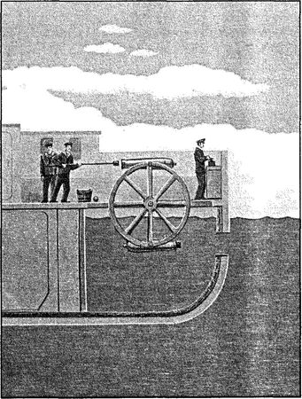 Известный судостроитель капитан Кольс решил задачу по-другому: он предлагал выделить на судне специальный затопленный водой отсек, внутри которого установить вращающийся барабан с двумя орудиями. Орудия размещались на барабане так, что, когда одно из них находилось наверху для заряжания, другое располагалось внизу в положении для выстрела — дулом к подводному отверстию в борту. Воспламенение заряда осуществлялось с помощью электрического тока. После выстрела барабан поворачивался на пол-оборота, поднимая выстрелившее орудие для заряжания, а верхнее орудие опуская в воду для нового выстрела. При заряжании дуло герметически закрывалось пергаментом. Вращение производилось специальным механизмом.