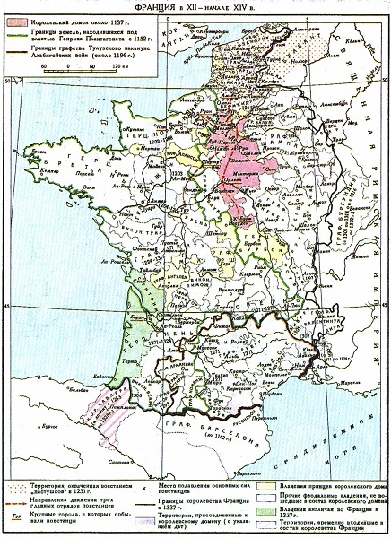 Чтобы придать нашей карте некоторую точность, надо было изобразить Францию в определенный год царствования Людовика Святого, и нам представилось, что это должен быть 1259 г., когда Людовик IX, ратифицировав Абвильский договор, заключенный в предыдущем году с Англией, упрочил большую часть завоеваний Филиппа-Августа за счет возвращения некоторых земель и вернул под свой сюзеренитет герцогство Гиенское, оммаж за которое не приносили ни разу с начала века. Эта дата тем удобнее, что в 1258 г. король Франции подписал с королем Арагона Корбейльский договор, по которому оба суверена, отказавшись: французский — от притязаний на фьефы Каталонии и Руссильона, арагонский — от притязаний на земли, подчиненные до альбигойской войны графству Тулузскому, закрепили более чем на три века общую границу своих государств. Таким образом, мы предлагаем читателям такую карту Франции, какой ее сделала политика Людовика Святого.
